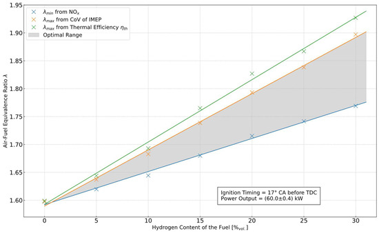 Optimal air–fuel equivalence ratio as a function of hydrogen content of the fuel. The gray-shaded area represents the range where emissions, engine smoothness , and thermal efficiency criteria are all met.