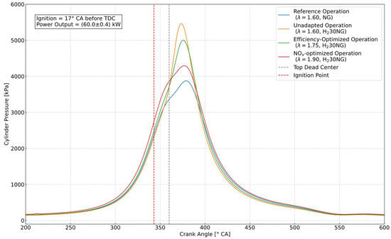 Cylinder-pressure profiles of the reference operating point with natural gas and two different optimized operating points with a 70/30 vol./vol. natural gas–hydrogen mixture.
