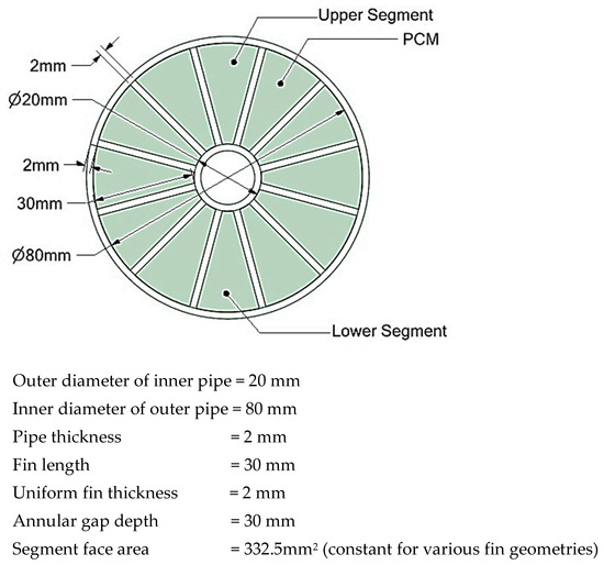 The system under investigation is a finned double-pipe heat exchanger, in which the annular gap is divided into 12 segments by longitudinal fins. Each segment is filled with phase change material, and the volume of these segments remains constant across different fin configurations (segment face area equals 332.5 mm2). The depth of the annular gap, corresponding to the fin length, is 30 mm. The outer pipe is maintained at a constant wall temperature of 65 °C, while the inner pipe is held at 48 °C. The detailed dimensions of the double-pipe heat exchanger are illustrated in Figure 1.