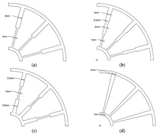 Different configurations of fin geometries. (a) Single-step thickness reduction fin; (b) smooth thickness reduction fin; (c) step thickness reduction/expansion fin; (d) smooth thickness reduction fin.