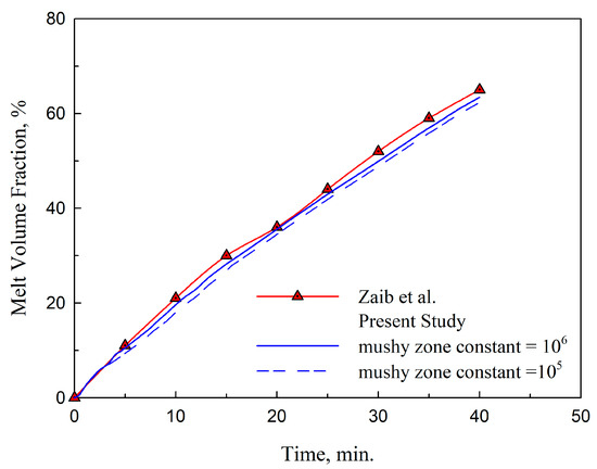 To validate the present numerical model, a λ-shaped fin configuration within a double-pipe heat exchanger was selected for comparison with the results reported by Zaib et al. [16]. The annular space between the inner copper tube and the outer steel shell was filled with stearic acid as a PCM. The inner pipe wall was maintained at a constant temperature of 358 K (isothermal boundary), while the outer shell was treated as adiabatic. The PCM was initially at a uniform temperature of 300 K. As shown in Figure 3, the simulation results from the current study closely match with those reported in Ref. [16], with the deviation in the melt volume fraction within about 5%. This good agreement confirms the accuracy and reliability of the developed numerical model. The discrepancy in the melt volume fraction may be attributed to the value of the mushy zone constant (typically ranging from 104 to 107) used in the enthalpy–porosity method. This parameter significantly influences the damping of the velocity field in partially melted regions, thereby affecting the accuracy of the predicted melting front and melt fraction distribution. To further validate and enhance confidence in the robustness of the numerical model, a comparison between mushy zone constants 105 and 106 was conducted. The model showed best agreement with the reported results in Ref. [16] when using a mushy constant of 106, as shown in Figure 3.