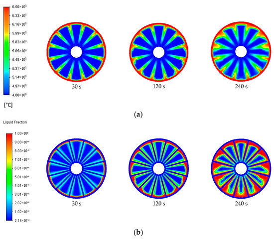 Melting behavior of PCM in a double-pipe heat exchanger with uniform-thickness fins. (a) Temperature contour lines. (b) Melt volume fraction contours.