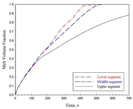 Melt volume fraction over the time in upper, middle, and lower segments.