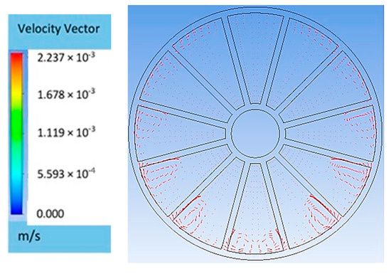 Figure 6 illustrates the velocity vectors in the melt layers across different heat exchanger segments. This figure reveals two convection vortices in the lower segment and one vortex at the corner of the middle segment, which enhance the melting rate in these regions due to the buoyancy force effect. In the upper segment, the free convection current appears weak in the molten zone.