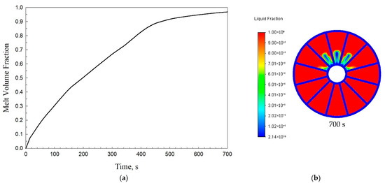 Figure 7 presents the total melt volume fraction across all segments. The melting rate of solid PCM follows a consistent slope until 450 s, after which the slope decreases, indicating a reduction in melting rate at the upper segments where convection currents are weak in the molten zones. Approximately 3% of the solid phase remains un-melted in the upper segments, as illustrated in Figure 7b.