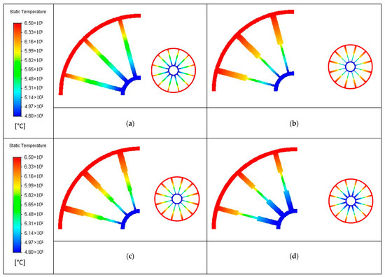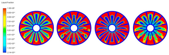 This is due to the increased thermal resistance in the thinner sections, which leads to obstruction of heat flow and the rising of temperature. However, in the case of the reduction/expansion fin geometry, at a distance of 16 mm from the hot pipe, the temperature trend reverses. The fin temperature becomes lower than that of the uniform-thickness fin due to the increase in thickness, which facilitates greater heat flow. It is important to highlight that the increase in fin temperature enhances natural convection currents within the melted layers of PCM, thereby accelerating the overall melting process. This phenomenon is depicted in Figure 10, which presents the melt volume fraction for various fin geometries after 300 s of heat charging. It is evident that a greater melt volume is achieved, with fins featuring stepped thickness reduction, attributed to the enhanced convection currents at the fin edges, since the temperature is relatively high.