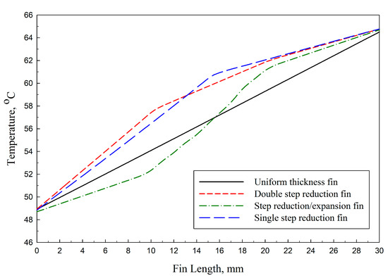 As previously mentioned, three geometries of fins with stepped thickness reductions were investigated to enhance the heat transfer and improve the melting rate within the segments of a heat exchanger. The first geometry is a single-step reduction in thickness located at the midpoint of the fin. The second geometry includes two-step reductions along the fin length. The third geometry also includes two steps of thickness change, which represent reduction/expansion of the thickness along the fin length. All of these configurations maintain the same volume of PCM within each segment to ensure a fair comparison. Figure 8 illustrates the temperature variation along the fin length for different fin geometries. As shown in Figure 8, a sudden reduction in fin thickness extends the high-temperature region along the fin length, despite having the same temperature difference between the inner and outer pipes. This effect is more clearly demonstrated in Figure 9, which shows the detailed temperature distribution along the fin length. At a distance of 10 mm from the hot pipe, the temperatures of fins with a sudden thickness reduction increased by approximately 5% (a 3 °C rise), compared to the fin with uniform thickness. At the midpoint of the fin length, the fin with a single-step reduction reached a temperature 4 °C higher (a 7% increase), while the fin with a two-step reduction showed a 3.25 °C increase, compared to the uniform-thickness fin. These two fin geometries showed a higher temperature rise along the fin length.