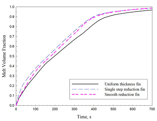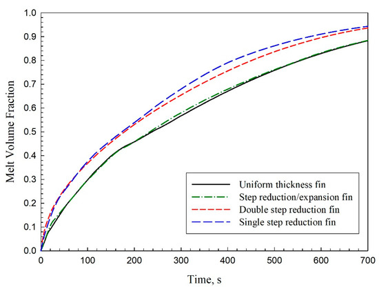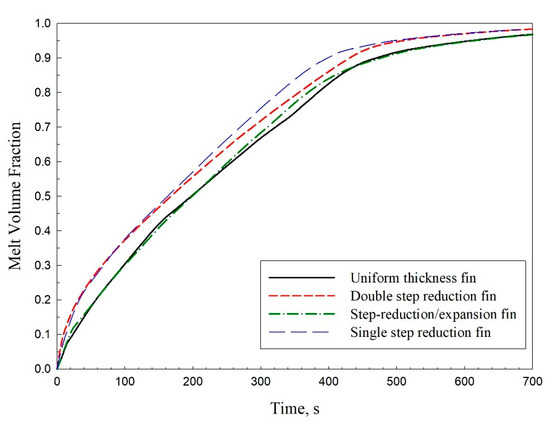 Total melt volume fraction for smooth- and single-stepwise thickness reduction fins.