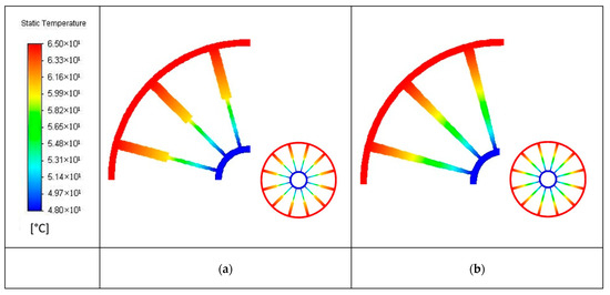 Temperature contours of smooth and stepwise fin thickness reductions. (a) Single-step thickness reduction fin. (b) Smooth thickness reduction fin.