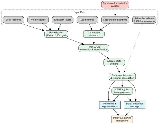 Energy planners worldwide have developed various methods and tools to identify high-quality locations for large-scale solar and wind projects. These approaches typically combine resource mapping, Geographic Information System (GIS)-based land filtering, cost assessment, and stakeholder input to rank or zone areas for development. For example, prior to the release of the first ISP, AEMO and DNV GL developed a multi-criteria scoring model to rank every 5 km × 5 km grid cells based on solar and wind resource, land cover, terrain complexity, protected areas, proximity to transmission, infrastructure and access, and population density, in order to support the identification of REZs [11]. Such a GIS-based Multi-Criteria Decision Analysis (MCDA) framework is very common in the literature. A 2020 review found 85 papers using this approach for renewable energy site selection from 2001 to 2018 [12], with possibly many more in recent years (e.g., [13,14,15,16]).