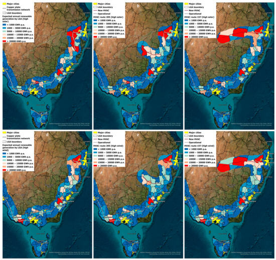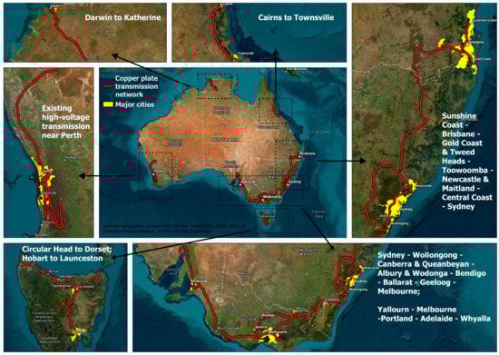 In this study, we treat the 275–500 kV network that links Australia’s major load centres (e.g., Brisbane, Sydney, Melbourne, Adelaide, Perth, and others) as a “copper plate” with unlimited capacity. This backbone, as shown in Figure 2, represents the minimum viable grid that is almost certain to be reinforced as renewable deployment grows. For example, the Sydney Ring (part of the copper plate backbone) is currently being extended with projects such as the Hunter Transmission Project north of Sydney [27] and the Sydney Southern Ring [28]. Other existing high-voltage corridors and planned transmission upgrades are not included in the backbone so as not to overestimate opportunities along lines that may remain constrained.