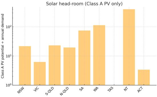 To avoid siting on incompatible land, we apply an exclusion mask comprising several layers: (i) protected areas from ProtectedPlanet.net (January 2025 snapshot, comprising national parks, International Union for Conservation of Nature categories I–VI reserves, Ramsar wetlands, United Nations Educational Scientific and Cultural Organization Biosphere Reserve, and world heritage sites) [33], where any overlapping 250 m pixel is removed; (ii) the urban footprint from the NASA Global Human Built-up and Settlement Extent (HBASE) raster (10 m) [34], which excludes any pixel intersecting built-up land; and (iii) slope and native forest, derived from the 30 m Shuttle Radar Topography Mission (SRTM) Digital Elevation Model (DEM) [35] and Department of Agriculture, Fisheries and Forestry “Forests of Australia 2023” layer [36], where pixels are excluded if more than 50% of their area has a slope > 15° or native forest cover. Prime agricultural land, threatened-species habitat, and indigenous cultural sites are not currently excluded due to a lack of nationally consistent data. These omissions are discussed in Section 4.2.