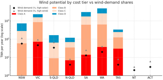 To streamline subsequent allocation, LCOE values are discretised into five cost classes (A–E) with AUD 10/MWh increments (A < 50; B 50–60; … E > 80). This class structure allows the development of both the state-level supply curves (Section 3.1) and the tier-filling algorithm described next (Section 2.4).