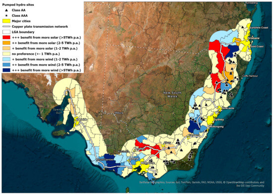 LGA and electorate boundaries and significant urban area polygons come from the Australia Bureau of Statistics (ABS) Digital Boundary Files [37]. Existing transmission routes from Geoscience Australia [38] are used to construct the copper plate backbone between the significant urban areas, as described in Section 2.1. The Euclidean distance from each cell to the copper plate and the load centres (whichever is nearest) is calculated as discussed in Section 2.1. LGA polygons serve as the aggregation zones in Section 2.5.