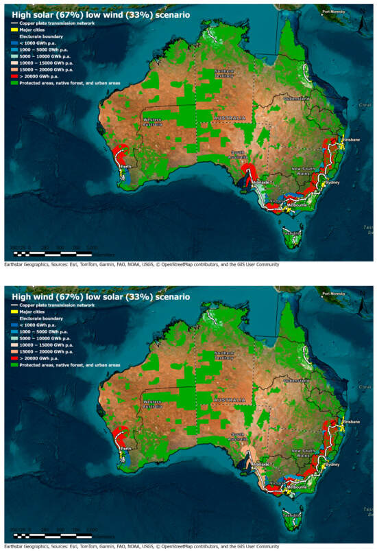 We model a fully decarbonised energy future in which all stationary electricity and all end-uses currently met by fossil fuels, including land transport, heating, and industry, are electrified. Current Australian electricity consumption averages around 10 MWh per capita per year [25]. Doubling that figure to 20 MWh per capita per year captures the additional demand from electric vehicles, heat pumps, and electro-furnaces [26]. Existing hydro- and bioenergy are treated as fixed supplements, but solar PV and wind must supply more than 95% of the electricity demand. Because the optimum technology split is uncertain and strongly influences land use and grid flows, we analyse two bounding mixes: