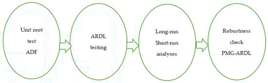 The coefficient of the error correction term (ECM), denoted as β, reflects the speed at which the variables return to equilibrium after a short-term disturbance. This coefficient must be negative and statistically significant to confirm the existence of a stable long-run relationship. To assess the adequacy of the estimated ARDL model, several diagnostic tests are conducted. These include tests for serial correlation, normality of the error term, and heteroscedasticity. The goal of these tests is to ensure the validity and reliability of the model’s estimates. For more detailed discussions on the application and interpretation of the ARDL approach and its diagnostics, see [63,64].