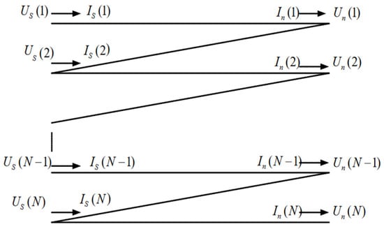Each winding turn is defined as a transmission line element connected sequentially according to the actual winding geometry, forming the multi-conductor transmission line network shown in Figure 1. Here, S denotes the line starting terminal and n the ending terminal; Us and Is represent the input voltage and current at the winding head, while Un and In correspond to the output quantities at the winding tail. The slash symbols indicate electrical continuity between winding terminals. For continuous windings, the numbering starts from the first turn at the high-voltage terminal and ends at the last turn connected to the grounding lead.