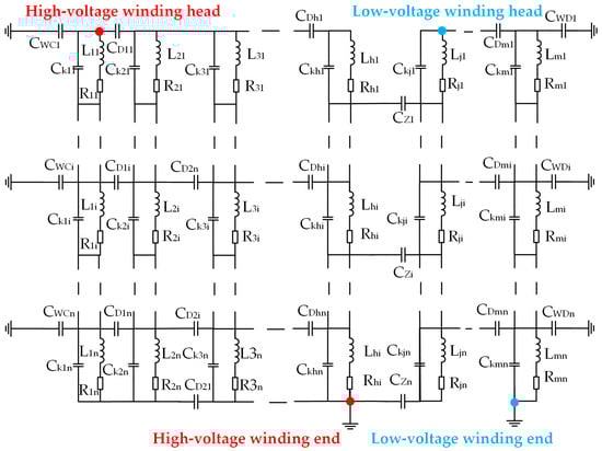 The established model is shown in Figure 2, where CWC is the coupling capacitance between each section of the high-voltage winding and the tank; CD is the coupling capacitance between different sections of the winding; Ck is the coupling capacitance between adjacent sections of the same layer of the winding; CZ is the coupling capacitance between the high- and low-voltage windings; CWD is the coupling capacitance between each section of the low-voltage winding and the core; R is the internal resistance of each section of the high- and low-voltage windings; and L is the self-inductance of each section of the high- and low-voltage windings.
