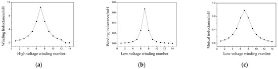 Winding inductance consists of self-inductance and mutual inductance components. Figure 4a and Figure 4b, respectively, depict the mutual inductance distributions of the 7th section (geometric center) in the 1st layer of high-voltage and low-voltage windings, where the mutual inductance of the 7th section equals its self-inductance value. Observations reveal that the mutual inductance between adjacent sections is maximal (approximately 85% of the self-inductance value), decaying exponentially with increasing spacing (less than 5% of the self-inductance value when the spacing exceeds 3 sections). The mutual inductance distribution between high-voltage and low-voltage windings (Figure 4c) indicates that the mutual inductance of corresponding sections (e.g., the 7th section of the high-voltage winding and the 7th section of the low-voltage winding) is maximal, while the mutual inductance of non-opposing sections decreases sharply with the increase in section number.