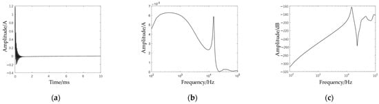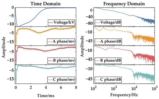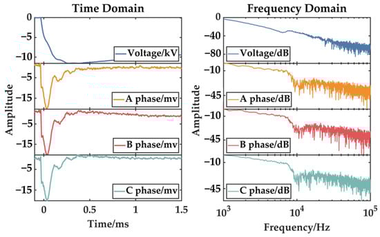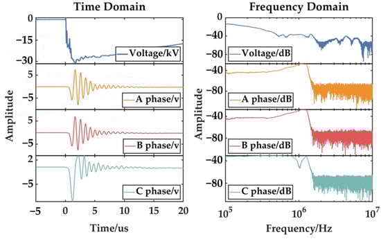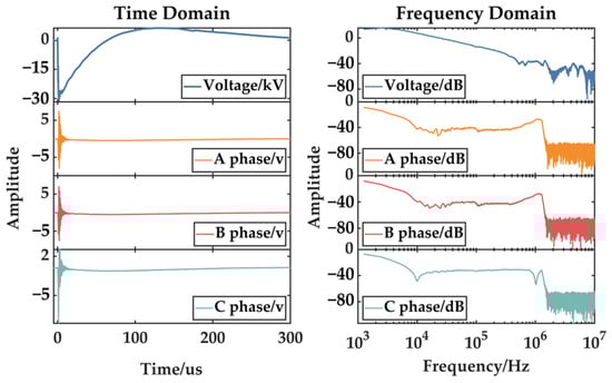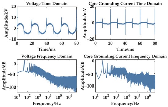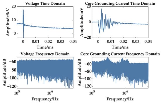 Figure 12 shows the core grounding current’s response characteristics. Like lightning and switching impulse voltages, partial discharge currents couple to the core capacitively. The complex LC network in the path induces multiple high-frequency oscillations (1–30 MHz) in the core. In the frequency domain, spectrum energy concentrates in the high-frequency band of the electric stress. Due to coupling path impacts, the core grounding current’s time-domain waveform loses the original features of the winding-borne electric stress.