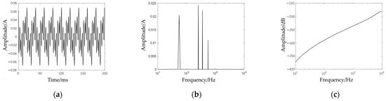Core grounding current under power-frequency-harmonic-combined voltage: (a) time-domain diagram, (b) frequency-domain diagram, (c) voltage–current transfer function.