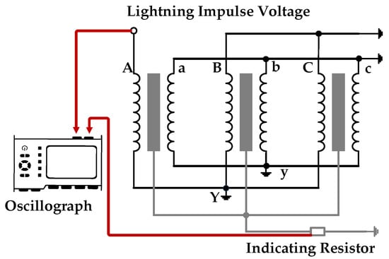 When subjecting the transformer to a lightning impulse test, a standard lightning impulse voltage was applied to one high-voltage winding, with the remaining two high-voltage windings and all low-voltage windings grounded. The core grounding wire was connected to an indicating resistor, and the core grounding current was obtained by measuring the voltage across this resistor. The specific connection is shown in Figure 14.