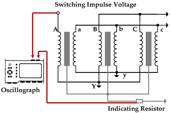 In the switching impulse test on the transformer, a standard switching impulse voltage was applied to one high-voltage winding, with the other two high-voltage windings left open-circuited. The low-voltage winding neutral was grounded, and the core grounding wire was connected to an indicating resistor. The core grounding current was obtained by measuring the voltage across this resistor. The specific connection is shown in Figure 17.