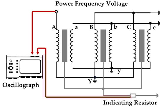 In the power-frequency voltage test on the transformer, a power-frequency voltage was applied to one high-voltage winding, with the other two high-voltage windings open-circuited. The low-voltage winding neutral was grounded, and the core grounding wire was connected to an indicating resistor. The core grounding current was obtained by measuring the voltage across the indicating resistor. The specific connection is shown in Figure 20.