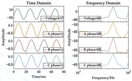 As presented in Table 4, the core grounding currents of phases A, B, and C under power-frequency excitation exhibit a fundamental component at 50 Hz. Measured amplitudes demonstrate close agreement across all three phases.
