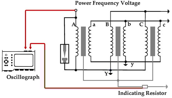 In this study, to analyze the core grounding current response during partial discharges under power-frequency steady-state voltage, a needle-plate partial discharge (PD) defect was paralleled at the winding terminal to simulate PD occurrences under power-frequency voltage [26]. The specific connection is shown in Figure 23.