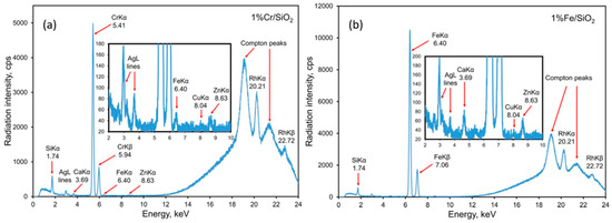 (a) Energy-dispersive X-ray fluorescence (EDXRF) spectrum of the 1%Cr/SiO2 catalyst. The measurement was conducted using a 30 kV voltage in an air atmosphere, with a 100 µm silver primary beam filter and a counting time of 120 s. Characteristic peaks for Si Kα (1.74 keV), Cr Kα (5.41 keV), Cr Kβ (5.94 keV), Fe Kα (6.40 keV) and Zn Kα (8.63 keV) are visible. Rh Kα (20.21 keV) and Rh Kβ (22.72 keV) peaks originate from the Rh target of the X-ray tube. (b) X-ray fluorescence (XRF) spectrum of the 1% Fe/SiO2 sample measured at 30 kV in an air atmosphere using a 100 μm silver (Ag) primary beam filter, with a counting time of 120 s. Characteristic peaks for Si Kα (1.74 keV), Cr Kα (5.41 keV), Cr Kβ (5.94 keV), Fe Kα (6.40 keV) and Zn Kα (8.63 keV) are visible. Rh Kα (20.21 keV) and Rh Kβ (22.72 keV) peaks originate from the Rh target of the X-ray tube.