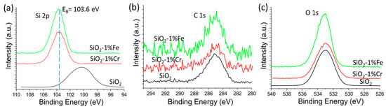 Figure 3 collects the Si2p, C1s and O1s core levels. The position of the C1s and O1s peaks equals 285 eV and 533 eV for all samples. In the case of a silica sample with additive components of iron and chromium, the position of the Si2p peak at 103.6 eV corresponds to the SiO2 function. The Si2p peak is shifted by about 4 eV towards lower energy for the reference sample. It consists of two spin–orbit doublets related to the clean Si and SiO chemical states in the base material before applying the chemical procedure [62]. The Si2p deconvoluted lines are presented in Figure S5 of the Supplementary Materials.