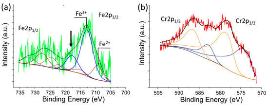 The deconvoluted core lines of Fe2p and Cr2p, presented in Figure 4a,b, reveal a complex structure of the measured electronic states of iron and chromium. Both spectra consist of two peaks localized at 712.5 eV, 726.8 eV for iron and 578.4 eV, 586.4 eV for chromium, with binding energies related to spin-orbit coupling for the 2p state of 3d elements. The deconvolution of the Fe2p photoemission line presented in Figure 4a reveals the presence of mixed Fe2+ and Fe3+ oxidation states with contributions of about 20% and 80%, respectively. The lower binding energy position of the Fe2p3/2 component and the presence of the feature at 718 eV in Figure 4a suggest the presence mainly of Fe3+ ions in the sample. The Cr2p line shape, on the other hand, is more complex and contains two doublets of components. The first one, with a lower binding energy, may indicate the presence of chromium in the metallic state, while the second doublet suggests the presence of Cr3+ in the test sample.