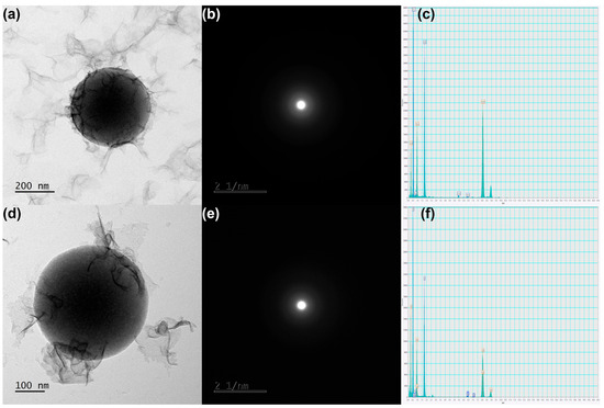 The bottom row relates to an analogous material with approximately 1 wt% iron. In the TEM image (Figure 5d), the SiO2 microsphere is equally monodisperse. More undulating, locally thicker lamellae are observed on their surface, interpreted as amorphous iron deposited as nanoscopic flakes. The entire core retains a continuous contrast and the lack of bright edges indicates no crystalline agglomerates of hematite or magnetite have formed in the studied fragment. The SAED (Figure 5e) shows an identical pattern to chromium: a strong central spot plus a fuzzy halo, demonstrating the completely amorphous nature of both the silica and the Fe flakes. The EDX spectrum (Figure 5f) contains the dominant Si-Kα and O-Kα signals and distinct Fe-Kα (6.40 keV) and Fe-Kβ (7.06 keV) peaks. The intensity of the iron lines here is slightly higher than the chromium lines in the sample above, suggesting a thicker local Fe layer, with visible C and Cu signals from the substrate. As shown in Tables S2 and S3, Supplementary Materials, we collected the TEM-EDS quantitative analysis of Cr and Fe NPs embedded in silica gel (sol-gel), which confirmed the qualitative and quantitative EDXRF analysis (Table 3). The results indicate that the two techniques are both consistent and complementary in determining the sample composition with respect to the analyzed elements.