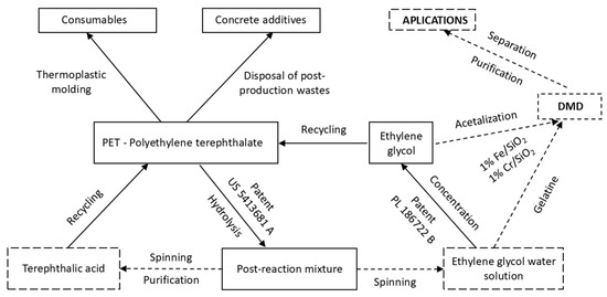 General idea of rPET recycling depending on the chosen path (the dashed lines indicate significant innovation in the rPET recycling process described in this article, the solid lines describe the current known solutions), where the acronym DMD stands for 2,2-dimethyl-1,3-dioxolane.