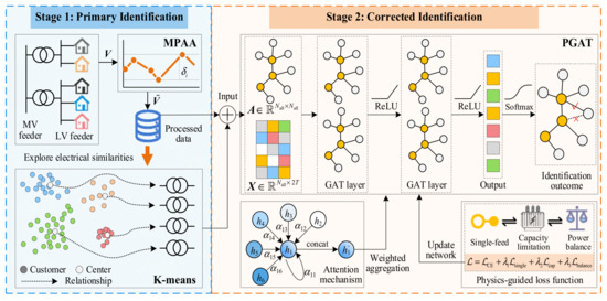 In recent years, the Physics-Guided Neural Network (PGNN), an innovative method combining physical knowledge with deep learning, has gained widespread attention in the power sector [24,25]. Inspired by this, this paper proposes a novel two-stage transformer–customer relationship identification strategy for LVDG using PGAT. The initial identification of transformer–customer relationships is achieved through a MPAA-K-means algorithm. A PGAT model is proposed to ensure node representations align with grid topology and electrical characteristics. This enables more accurate identification of transformer–customer relationships. This study makes three key contributions: