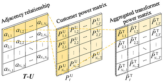 where denotes nodes i and j are connected in the graph topology, otherwise they are disconnected. T is transformer nodes, where transformers on the same distribution line are considered connected. and denote the connection relationships between transformer nodes and customer nodes, obtained from the preliminary identification of transformer–customer relationships. U is customer node and is a zero matrix.