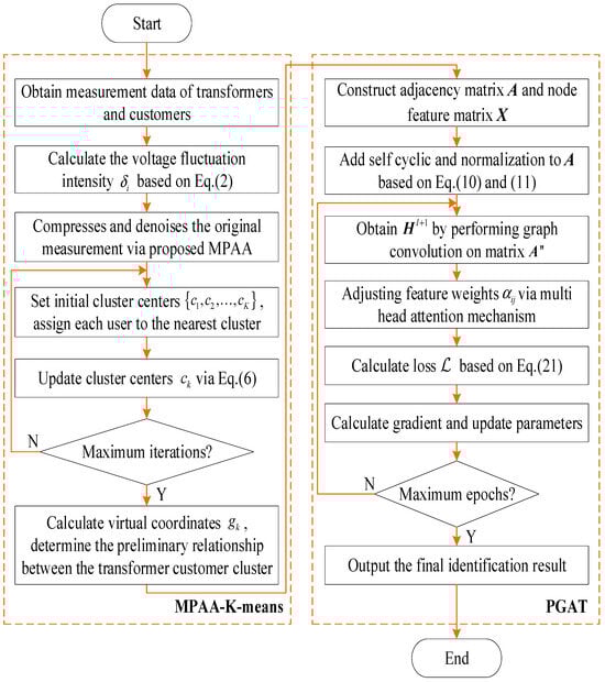 The proposed two-stage identification process for transformer–customer relationships in LVDG is illustrated in Figure 4. Initially, the voltage fluctuation intensity between transformers and customers is calculated, and the raw measurement data are compressed and denoised using the MPAA algorithm. Subsequently, K cluster centers are initialized according to the number of transformers and iteratively updated using Equation (6) until convergence. Preliminary identification of transformer–customer relationships is achieved by matching the virtual cluster center coordinates g of customer groups with transformer geographical locations. Then, the adjacency matrix A and feature matrix X are constructed based on the preliminary identification results. A GAT based on the multi-head attention mechanism is employed for node feature aggregation and learning. Finally, the physics-guided loss function L is computed using Equation (21) to update network parameters. The identification results are iteratively refined until reaching maximum training epochs, ultimately yielding transformer–customer relationships that comply with electrical and physical principles.