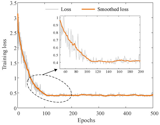 The PGAT model is configured with two hidden layers. The numbers of units in hidden layers are set to 128 and 256, respectively. The learning rate is set to 0.001. The dropout rate is set to 0.4. The Adam optimizer is employed with 500 epochs. Figure 5 presents the convergence curve of the training loss function for the PGAT model. As shown in Figure 5, the initial training loss is relatively high. This results from insufficient representation capability caused by random weight initialization. However, the training loss decreases rapidly as epochs increase, achieving significant convergence in about 100 epochs. This indicates that the initial identification results from Stage 1 provide high-quality input data for the model. Subsequently, the model examines deeper relationships between electrical similarity and topology. This ensures node feature aggregation aligns with operational characteristics of the LVDG. The loss eventually stabilizes with fluctuations around 0.42. This confirms that the physics-guided approach improves model convergence and feature representation.
