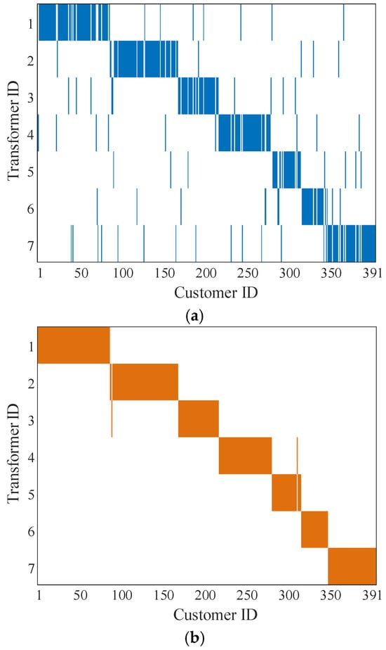 Results of the proposed two-stage transformer–customer relationship identification. (a) Preliminary identification result of Stage 1. (b) Refined identification results of Stage 2.
