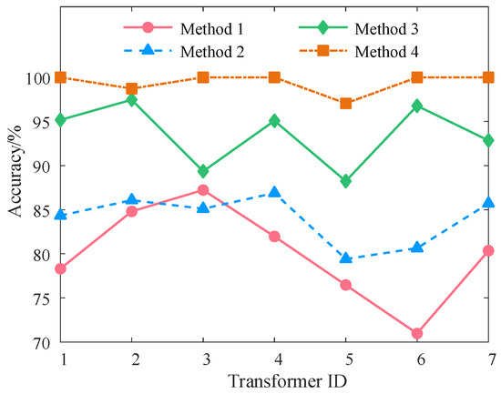 Figure 8 shows the accuracy of all methods across seven transformers. Table 2 summarizes the identification results of each method. Method 1 shows significant accuracy fluctuations due to its direct K-means clustering on raw voltage data without noise filtering or relationship modeling. The lowest accuracy (70.97%) occurs for Transformer 6. Method 2 achieves more stable clustering (84.65% accuracy) through MPAA-based preprocessing that effectively removes noise and redundant information. This represents a 3.83% improvement over Method 1. Method 3 addresses the limitations of K-means in complex relationship modeling through refined identification based on the results of MPAA-K-means. The proposed method embeds LVDG characteristics into the training paradigm, significantly improving both accuracy and stability. It achieves 99.49% accuracy, representing a 5.37% improvement over Method 3. The effectiveness and superiority of the proposed physics-guided embedding paradigm are thus verified. The proposed method incorporates electrical characteristic constraints of low-voltage distribution networks into the model training paradigm, significantly improving recognition accuracy and stability. In summary, the significant advantages of the method proposed in this paper for the task of transformer–customer relationship identification are validated.