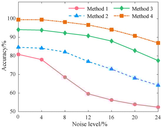 Finally, to analyze the impact of AMI measurement noise on model performance, Figure 9 presents the identification accuracy of the four methods under different noise levels. The results show that while all methods experience accuracy decline with increasing noise levels, their extent of decline differs significantly. Method 1 demonstrates the highest sensitivity to noise, with an average accuracy reduction of 4.73% per 4% noise increase. This occurs primarily because noise significantly distorts voltage distribution characteristics, leading to clustering errors. Method 2 employs the MPAA algorithm for data compression and denoising preprocessing, providing K-means with input data that better approximate true characteristics. An average accuracy reduction of 3.41% per 4% noise increase is shown. However, the limited clustering capability of K-means still constrains its performance under high noise conditions. Method 3 mitigates noise interference on local features through attention mechanism-based dynamic node weighting.