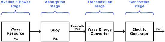 The process of converting wave energy into electrical power can be categorized into four distinct stages, as illustrated in Figure 1. The present study focuses on the control requirements of the intermediate conversion stages, with particular emphasis on buoy design and wave energy conversion. While the assessment of available wave resources is beyond the scope of this paper, the literature suggests several methodologies that could be incorporated before the deployment of the device. The reader is referred to [4] for further details.