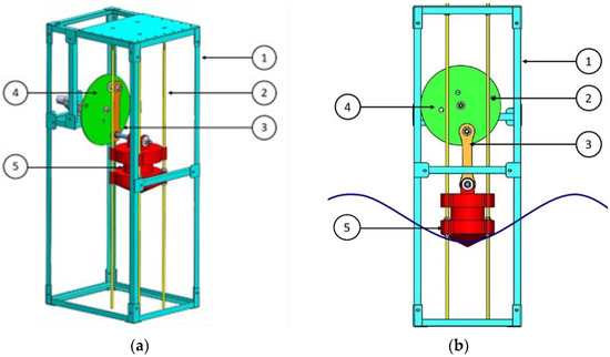 Operation of the oscillating buoy WEC. 1 support; 2 directional guides; 3 connecting rods; 4 flywheel; 5 buoy. (a) Restitution phase. (b) Traction phase.