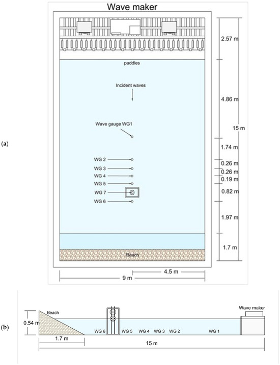 The tests were conducted in the 15 × 9 m wave tank of the Autonomous University of Campeche, Mexico (Figure 3a,b). There, regular or spectral waves of 0.02 to 0.40 m in height, and 1.0 to 6.0 s in period, can be produced. The wave generator is “snake” type, composed of 18 paddles, each of 0.50 m. The paddles have a dynamic absorption system to minimize re-reflected waves [54,55], and the wave generation system is controlled by Awasys software (Version 7.0) [56]. At the other end, the facility has a passive wave absorber of gravel, with D50, of 5.08 cm.