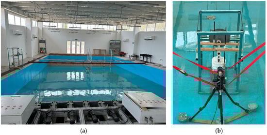 Experimental setup of the oscillating buoy. (a) Wave tank without the device. (b) The oscillating buoy with the high-speed camera.