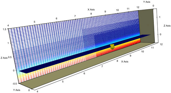 To implement the numerical model an appropriate mesh was defined to discretize the wave tank domain, balancing computational cost and accuracy of results. Three areas of progressive refinement were defined: (a) at the beginning of the wave tank (coarse); (b) at the top and bottom of the tank, smoothing between the first area (medium); and (c) where the buoy was located (fine). Figure 5 shows this computational mesh structure, showing the higher spatial resolution in the free water surface area, that ensures that the wave propagation is captured accurately. This refined region extends upstream of the buoy to 4H and 8A, where H represents the regular wave height and A denotes the maximum amplitude [68,69,70].