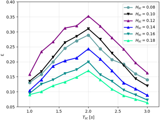 The relationship between the hydrodynamic efficiency ε and the wave period Tsc is seen to vary with the different wave heights Hsc (Figure 6). The bandwidth of the curves, which represents the range of values on the horizontal axis where the efficiency varies, tends to increase as Hsc increases. Also, for medium wave periods, the maximum values of hydrodynamic efficiency are seen, reaching up to 35%, and decreasing towards the extremes of the periods evaluated, with 15% for Hsc = 0.12 m.
