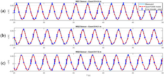 Two sets of tests were conducted to validate the OpenFOAM numerical model, and the experimental and numerical free surface results from the sensors in the wave tank were compared. First, tests were performed without the WEC device to validate the OpenFOAM model, Table 6. Subsequently, tests were conducted with the WEC device installed in the wave tank, and the experimental results from the sensors were compared with the numerical free surface results.