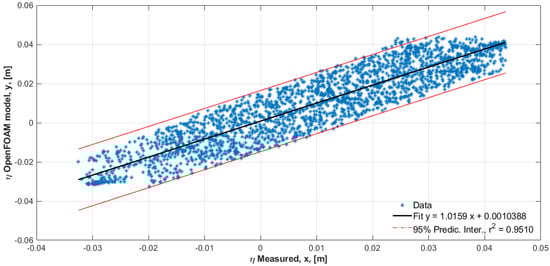 The boundary conditions specified in the OpenFOAM model are as follows. In the alpha.water file, zeroGradient is applied to the outlets, sides, buoy, and bottom of the starting field, to eliminate surface tension effects between the wall and the water–air interface. At the inlet and top, waveAlpha and inletOutlet were set to 0. In the velocity (U) file, the inlet boundary was set as waveVelocity type, and the outlet boundary was set as waveAbsorption2DVelocity type.